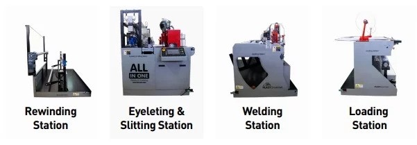 - All In One – Reduce bottle necks in your print finishing department. When you integrate in a single machine three different processes that are labor intensive (welding, eyeleting and slitting or rewinding) you will be boosting the efficiency of your operation.