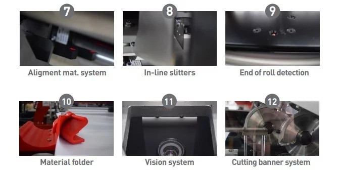 - Vision system for eyelet and cutting marks plus banner alignment – All In One integrates a complete vision system. Camera is able to read eyelet and cutting marks. An alignment sensor works when roll is unwound. If material is badly rolled the machine will automatically correct it to do a perfect job