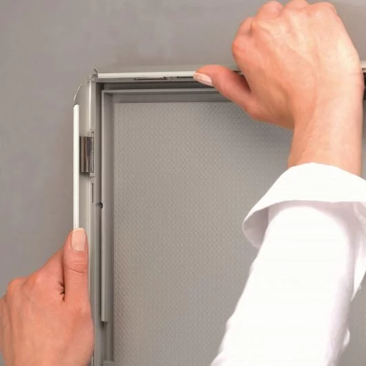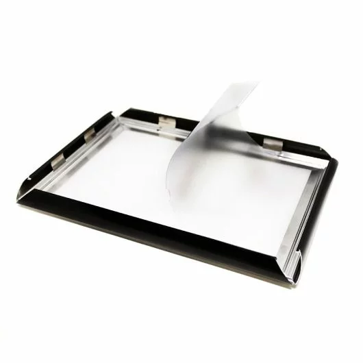 - Insert your poster: Remove the protective cover, place the poster and reposition the cover.