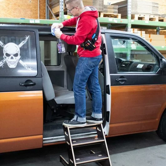 Thanks to its special design, the WrapStep can be pushed “into” the vehicle when the doors are opened! Its rubberised edges prevent damage to the bodywork and add-on parts. The robust wooden construction secures a safe stand and the steps are roughened for increased slip prevention.